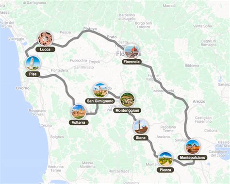- Toscana: Una ruta circular a través de las Colinas Pisanas con inicio y final en la misma Pisa, justo a los pies de su famosa torre inclinada y Plaza de los Milagros.