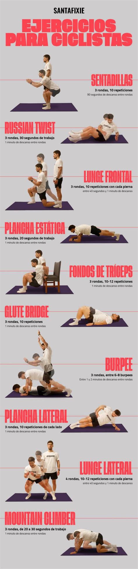 Estos ejercicios están diseñados específicamente para ciclistas que buscan entrenar en casa sin necesidad de máquinas o gimnasio. Cada rutina fortalece grupos musculares clave: piernas, core, espalda y brazos, esenciales para mejorar tu rendimiento sobre la bicicleta.