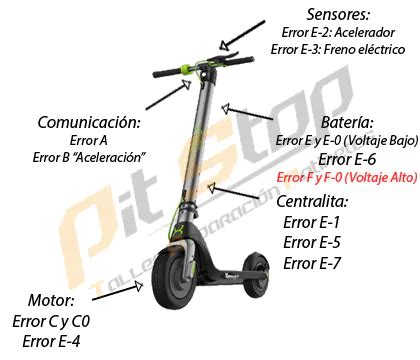 - Código E7: Se activa cuando el sistema detecta una sobretensión en el patinete, lo que puede dañar los componentes eléctricos. Esto suele ocurrir cuando se conecta el patinete a una fuente de energía que proporciona más voltaje del que debería.