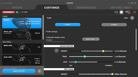 La aplicación E-TUBE PROJECT se utiliza para personalizar ajustes, actualizar el firmware y revisar errores del sistema, proporcionando mayor control sobre la experiencia de conducción. Los modos para E-bike de Shimano - ECO, TRAIL y BOOST - se pueden personalizar en 10 niveles de par diferentes entre 20-85Nm, dependiendo del modo de configuración.