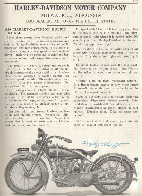 En 1926, se estableció un departamento especial para la venta de unidades Harley-Davidson a las fuerzas del orden público. Las motocicletas, al ser más rápidas y maniobrables que la mayoría de los coches, proporcionaban a la policía una ventaja considerable sobre los infractores. A partir de este momento, la Policía de Estados Unidos estableció excelentes relaciones con la marca.