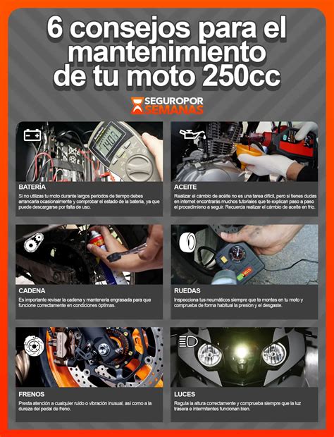 La cadena de transmisión es otro componente vital que debe ser inspeccionado regularmente. Verifique la tensión de la cadena cada 500 kilómetros y lubríquela cada 1,000 kilómetros, utilizando un lubricante de calidad que pueda optimizar su funcionamiento. También es aconsejable revisar el estado de los frenos y las pastillas, así como realizar una inspección visual de los neumáticos para detectar desgaste irregular o baja presión.