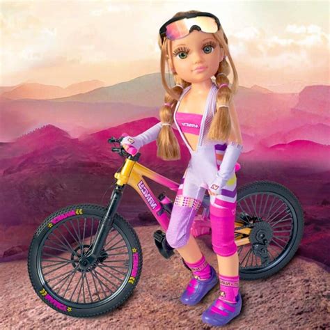 Nancy está lista para comenzar su ruta por la montaña con su nueva bicicleta Mountain Bike. ¡Funciona como una bicicleta profesional! Sube Nancy a la bici, pon sus pies en los pedales, empuja la bici y que empiece la ruta. ¡Nancy mueve las piernas como si estuviese pedaleando! La muñeca es articulada en rodillas para poder hacer el movimiento de las piernas.