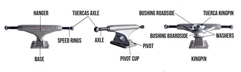 | Ejes (Trucks) | Piezas metálicas en forma de T | Sujetan las ruedas y permiten girar |
