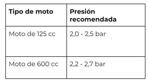 Nota: Siempre verifica las recomendaciones específicas del fabricante de neumáticos y el manual de tu moto.