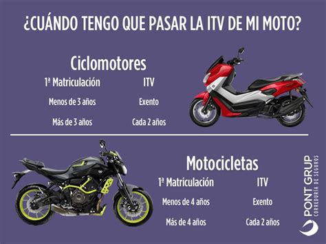 - Las motocicletas tienen que pasar su primera ITV transcurridos 4 años desde la fecha de matriculación.